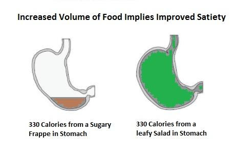 Appetite is not primarily controlled by the number of calories we consume, but rather, by the volume of food we eat. Therefore, if the total volume of food that passes through the digestive tract is high, we will feel satiated. For example, one tall Java chip frappe and one chicken Caesar salad at Starbucks have equal amount of calories (roughly 330 calories each). However, the quantity of food on a plate of Caesar salad is far more than that of a cup of frappe and keeps you fuller for longer, and hence, is a much healthier choice.